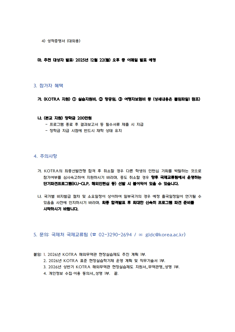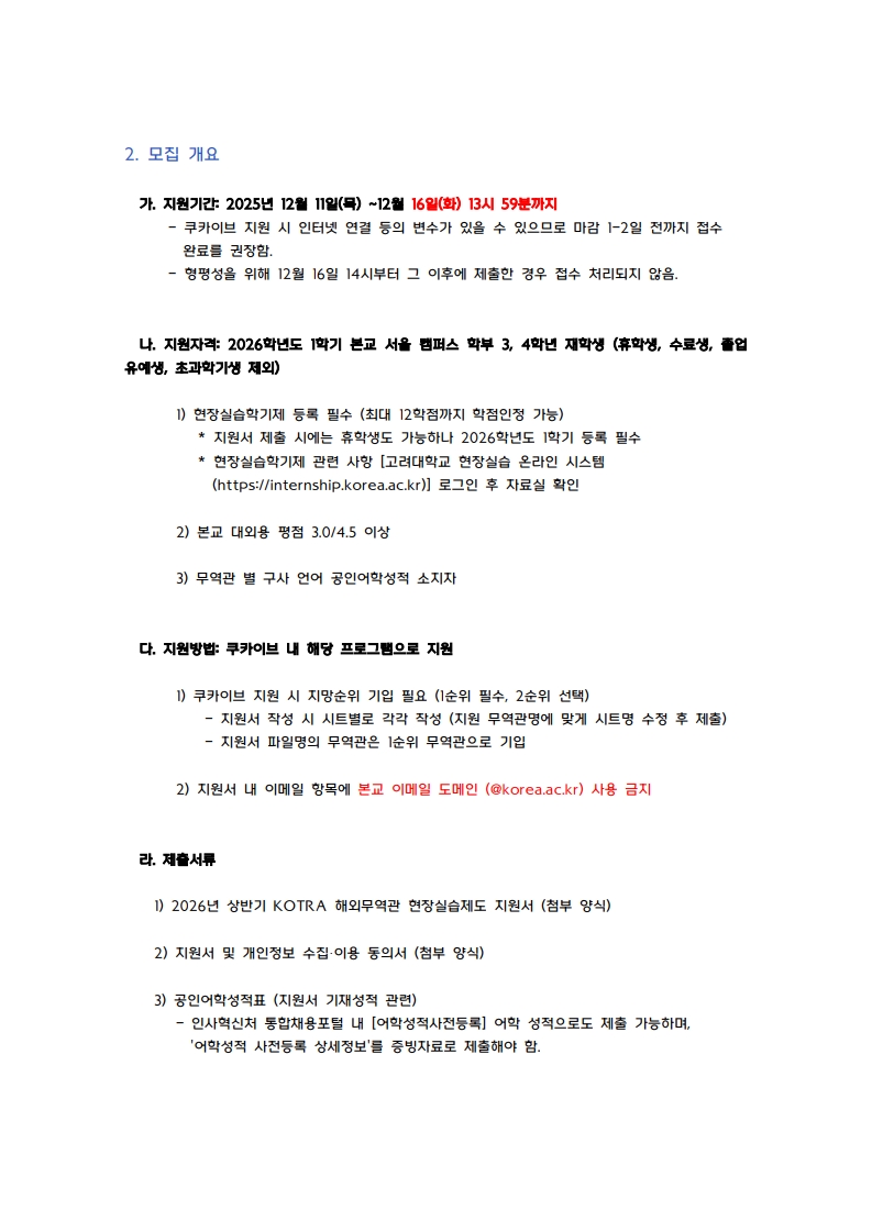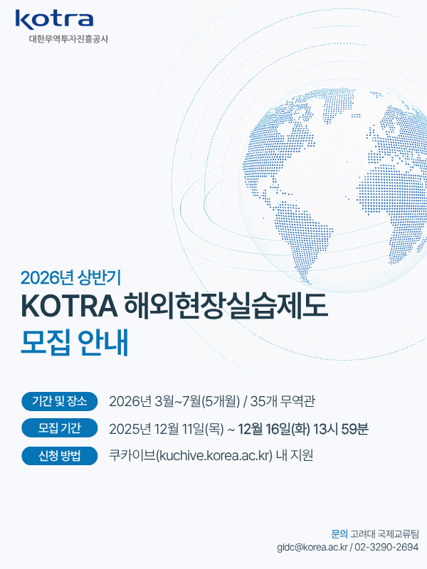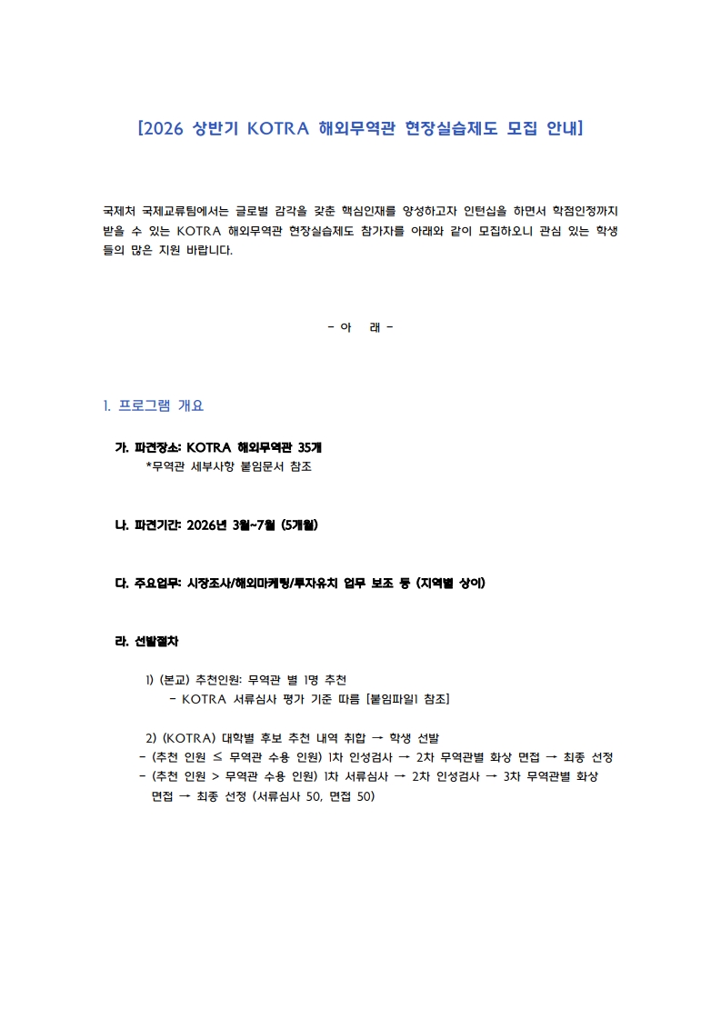 | 제목 | 2026년 상반기 KOTRA 해외무역관 현장실습제도 |